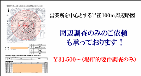 風俗営業許可申請における、サンプル図面/営業所を中心とする半径100mの周辺略図(図面例)もあります。http://huuzoku.blog.shinobi.jp/