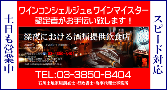 東京都: 深酒届【都内最安値75,000税別~】深夜酒類提供飲食店営業届・東京都深夜における酒類提供飲食店営業開始届出・バー、ダーツバー、ピアノバー、ワインバー、ショットバー開業手続 http:// ishikaw ajimusy o.blogs pot.jp/ 2016/02 /75000. html